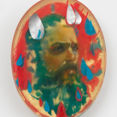 original painting of Brian Molko created by Marc Scheff using oil paint, gold leaf, and artresin epoxy resin